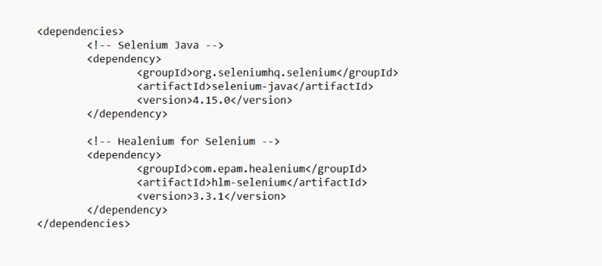 To connect Healenium with Selenium, you need to include the following dependencies in the pom.xml file.